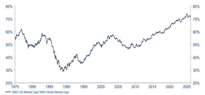 • Una mayor asignación a la renta variable europea también contribuye a mejorar el equilibrio de la cartera. Los inversores que siguen el índice MSCI World tienen actualmente cerca del 75% de su exposición a la renta variable concentrada en acciones estadounidenses en términos de capitalización bursátil (véase el gráfico).