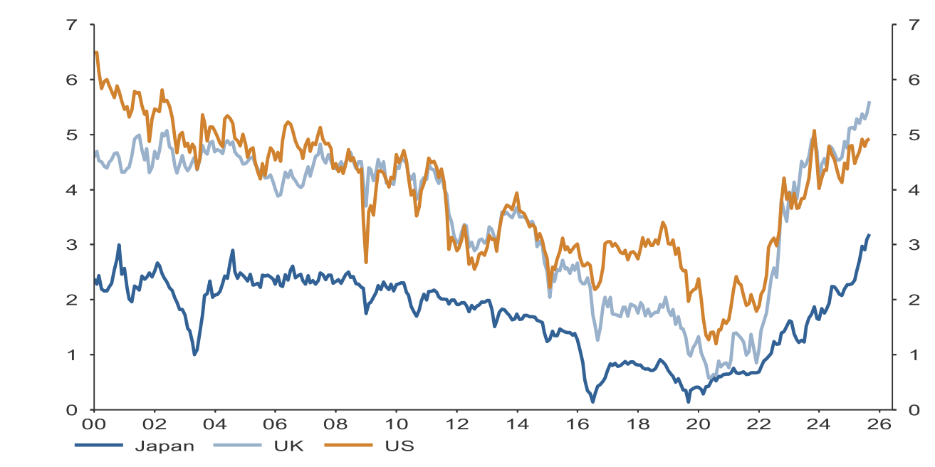 Los rendimientos a 30 años de algunos emisores soberanos importantes han alcanzado un nuevo máximo desde el cambio de milenio o se están aproximando a este nivel.