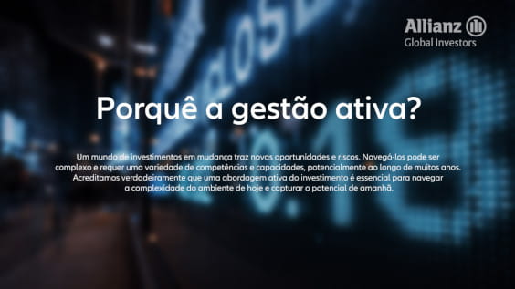 Os ativos totais sob gestão são ativos ou carteiras de títulos, valorizados ao valor atual de mercado, em que as empresas Allianz Global Investors são responsáveis, perante os clientes, pelo fornecimento de decisões discricionárias relativas à gestão de investimentos e à gestão de carteiras, diretamente ou através de um sub-advisor. Isto exclui os ativos pelos quais as empresas Allianz Global Investors respondem maioritariamente apenas por serviços administrativos. Os ativos sob gestão são geridos em nome de terceiros, bem como em nome do Grupo Allianz. Fonte: Allianz Global Investors. Eventuais diferenças nos totais são devidas a arredondamentos.